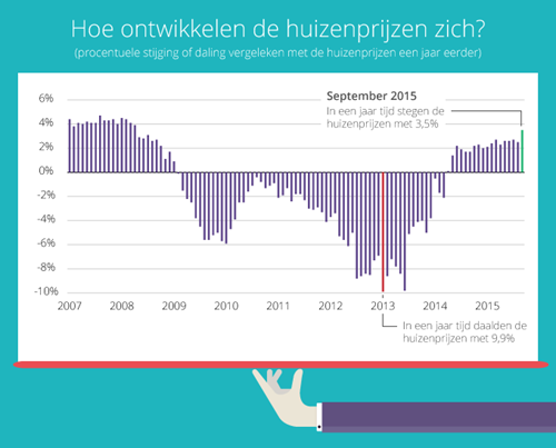 Wie een jaar geleden een huis kocht heeft een prima investering gedaan. Een huis dat in september vorig jaar € 300.000 kostte, is nu € 8.000 tot € 10.000 meer waard.