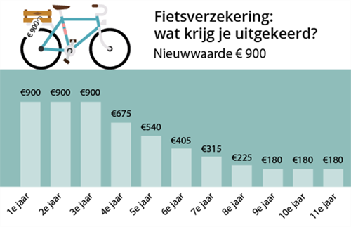 Drie jaar lang keert een verzekeraar genoeg geld uit om een nieuwe, vergelijkbare fiets te kopen. Ná drie jaar geldt de afschrijvingsregeling, waardoor je steeds minder krijgt uitgekeerd als er dan nog iets met je fiets gebeurt. Dit geldt overigens voor de doorlopende fietsverzekering.