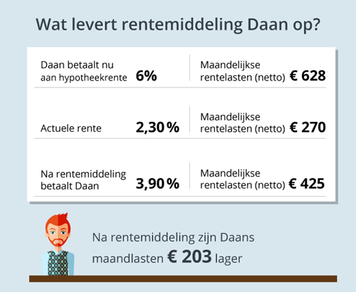 - De bank vergelijkt Daans oude rentetarief (6%) met de actuele rente voor een 4-jarige lening (2%). Het renteverschil (4%) lopen ze vier jaar lang mis. Dit verschil moet Daan via de rentemiddeling weer terugbetalen.