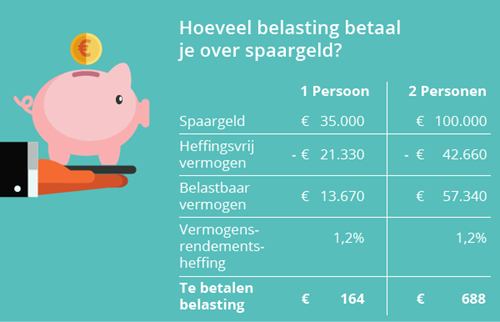 In het voorbeeld hierboven zie je dat je € 164 belasting betaalt wanneer je € 35.000 spaargeld hebt. Dat is natuurlijk te overzien, maar wel vervelend. Heel veel is daar niet aan te doen: je bent wettelijk verplicht om ál je vermogen aan te geven bij de belasting. Ook contant geld. Eind december een flink bedrag opnemen en dat na 1 januari weer op je rekening storten, is dus geen oplossing.