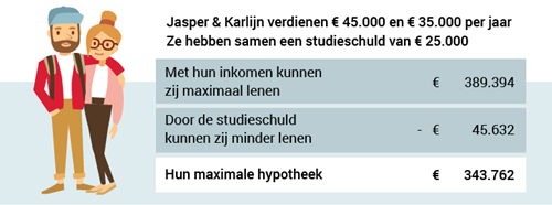 Jasper en Karlijn hebben een studieschuld van € 25.000. Hun maximale hypotheek wordt hierdoor € € 45.623 lager. Ofwel: voor iedere euro studieschuld, kunnen ze € 1,83 minder lenen.