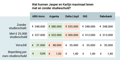 • Bij Argenta, een kleinere aanbieder, kunnen ze door hun studieschuld maar liefst € 48.000 minder lenen! Dat is € 1,92 per euro studieschuld. Argenta tilt dus veel zwaarder aan de schuld.