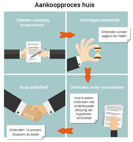 Bij het kopen van een woning is een mondelinge koopintentie niet bindend. Zelfs na het zetten van de handtekening op het koopcontract kan je er nog vanaf zonder het betalen van een boete. Daar heb je na tekenen drie dagen voor. Regel daarbij is dat er van die dagen maximaal twee dagen in het weekend mogen vallen.