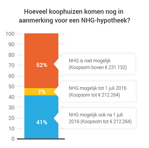 • Tot 1 juli 2016 geldt een NHG-kostengrens van € 245.000. De koopsom van je huis mag maximaal € 231.132 bedragen.
