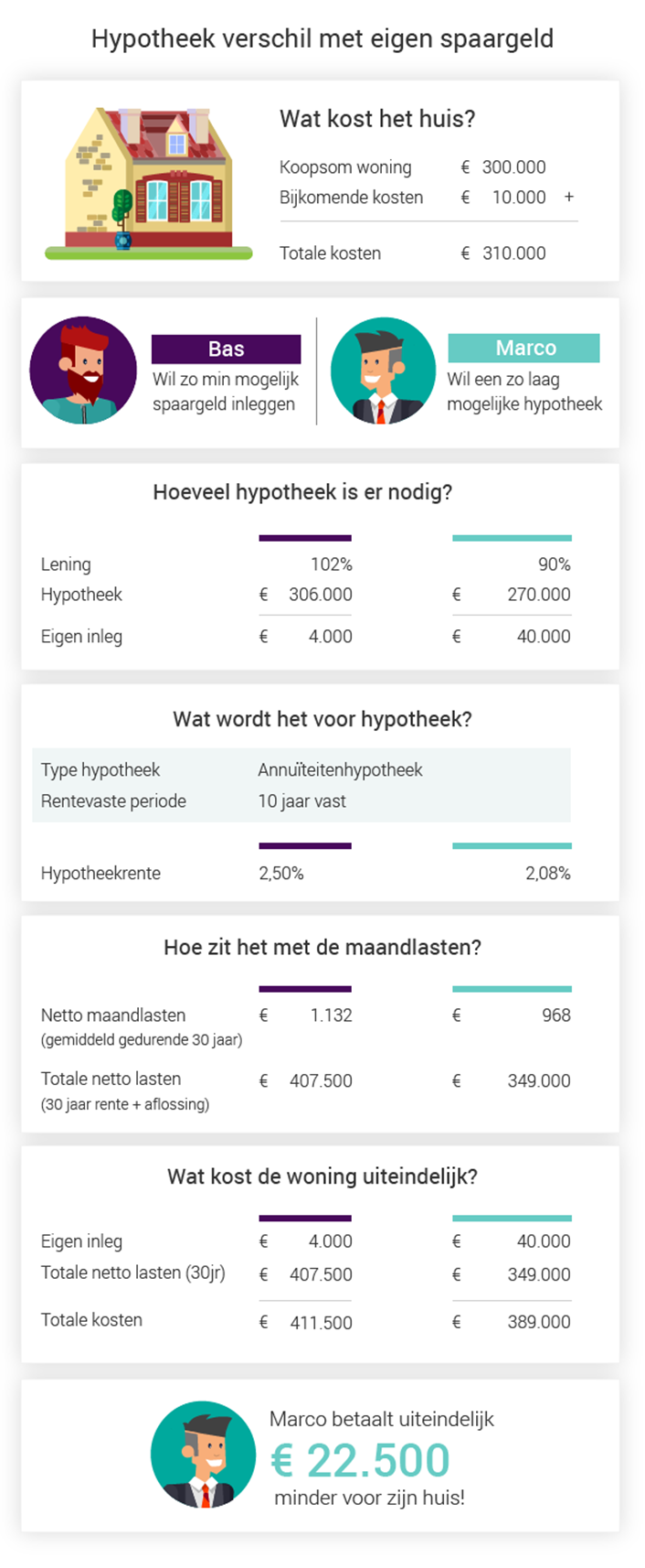 • Marco heeft de afgelopen jaren flink gespaard. Hij kan de bijkomende kosten direct betalen, en heeft dan nog € 30.000 spaargeld om in zijn huis te steken. Hij heeft daarom slechts 90% ofwel € 270.000 hypotheek nodig.