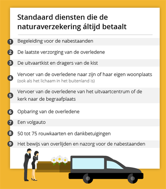 - Complete keuzevrijheid. Veel bloemen, een uitgebreide koffietafel en een gospelkoor? Geen probleem. Liever luxe drukwerk, een uitgebreide kerkdienst en een rouwauto met drie volgauto’s? Dat is ook mogelijk.