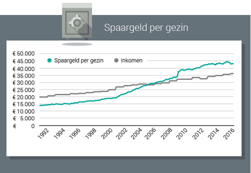 In de afbeelding zie je ook dat we sinds 2013 veel minder zijn gaan sparen. En in 2016 opnieuw. Ertussenin is slechts een heel klein herstel te zien.