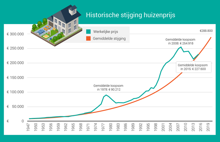 Historische ontwikkeling en prognose huizenprijzen sinds 1945