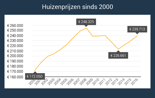 Laten we de huizenmarkt sinds 2000 als uitgangspunt nemen. De dip van de afgelopen jaren lijkt dan nog wel mee te vallen. Tussen 2003 en 2008 steeg de gemiddelde prijs van een huis met ruim € 50.000. Na de piek in 2008 vielen de huizenprijzen echter terug met ruim € 41.000. Een fors bedrag. Maar diezelfde terugval is dus relatief als we naar een langere periode kijken.