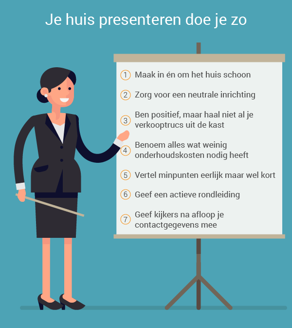 Laat de kijker alle ruimtes in de woning zien en laat hem niet alleen kijken. Sluiten ramen en deuren goed, staat er geen water in de kruipruimte en lopen kranen goed door? Zorgen die je weg kunt nemen door dit meteen samen met de kijker na te lopen. Een actievere houding van jou als verkoper geeft vertrouwen, bovendien zal de mogelijke koper minder snel zelf op onderzoek gaan.