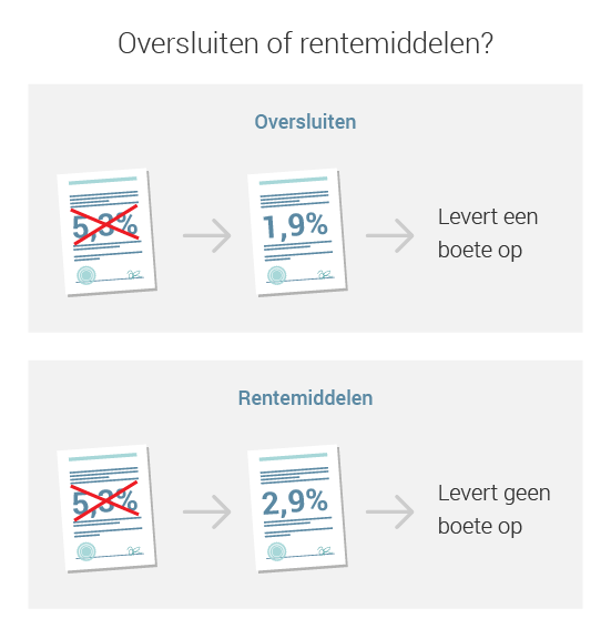 Het is niet voor iedereen mogelijk om in één keer de hele oversluitboete op tafel te leggen. Daarom is er nog een alternatief: rentemiddeling. Je smeert het verschuldigde boetebedrag dan uit over de nieuwe rentevaste periode. Voordeel: je hebt in één keer lagere maandlasten, zonder bijbetaling. Nadeel: je lasten zijn hoger dan wanneer je de boete in één keer zou betalen.