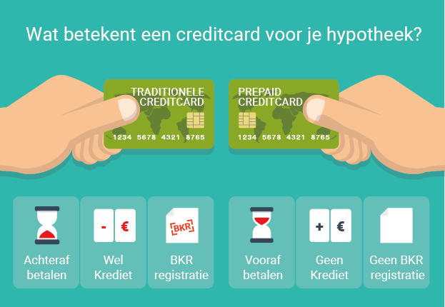 Met een gewone creditcard betaal je achteraf en dat is feitelijk kopen op krediet. Elk krediet wordt geregistreerd bij het BKR. Dit verlaagt wat je maximaal aan hypotheek kunt krijgen. Een prepaid creditcard werkt andersom. Je laadt op voorhand geld op de kaart en betaalt elke rekening meteen. Daarom krijg je geen BKR-registratie met een prepaid creditcard.