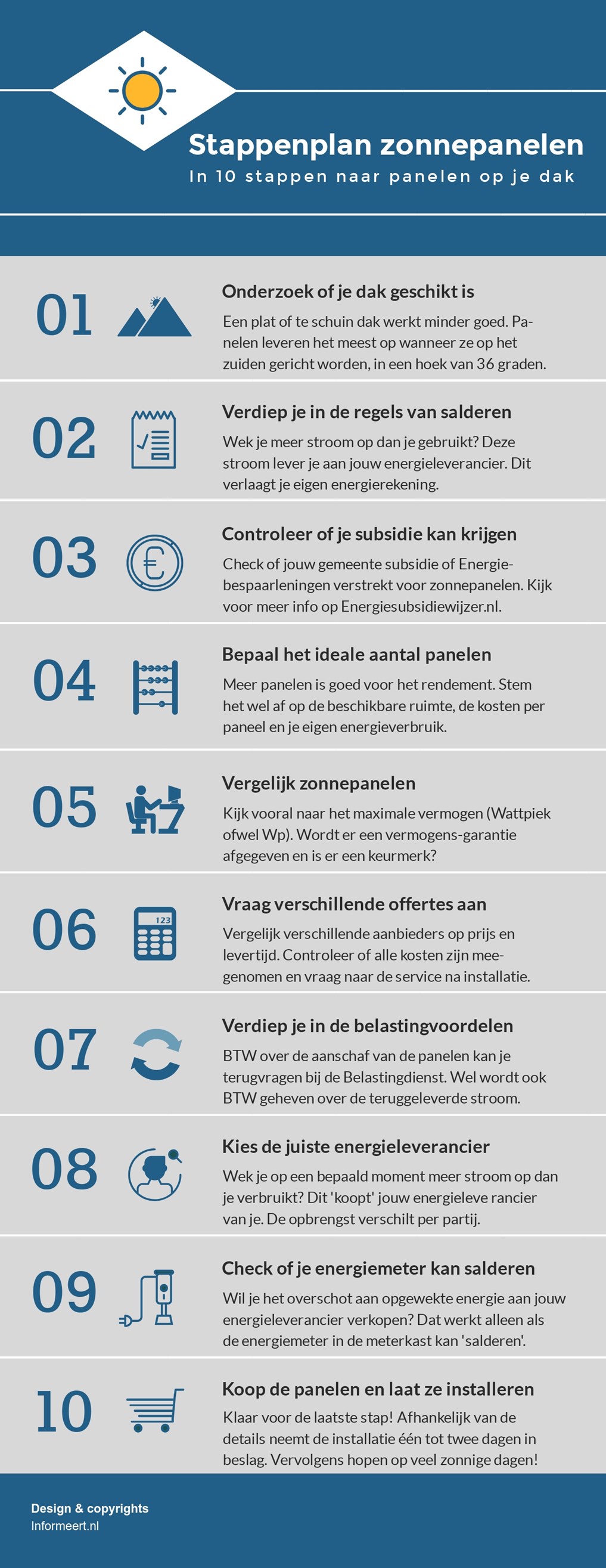 Het opwekken van stroom met zon, water of wind is niet het specialisme van De Financiële Alliantie. Vraag ons dan ook niet welk soort paneel jij het best op je dak kan leggen of wat de exacte opbrengst is van een bepaald type. Wel helpen we je graag op weg met de onderstaande infographic. Met het stappenplan bepaal je of de installatie van zonnepanelen iets voor jou is en hoe het aan te pakken.