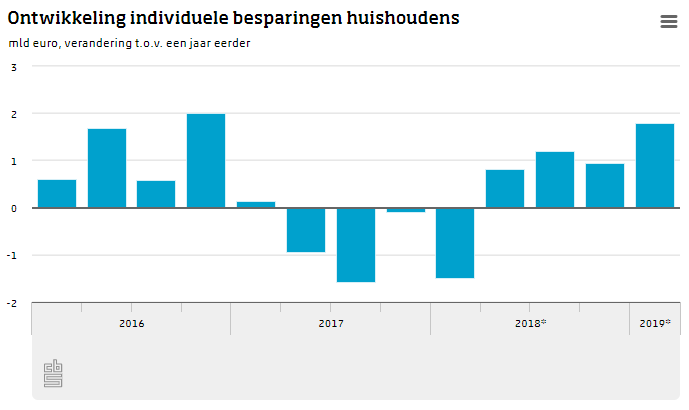 In het eerste kwartaal kochten Nederlanders meer producten en diensten dan in dezelfde periode vorig jaar. Ondanks de toename bleef er wel meer geld over. Het deel dat overblijft na aftrek van de aankopen wordt ook wel de individuele besparing genoemd. Die kwamen in totaal neer op 4,5 miljard, een stijging van 1,8 miljard ten opzichte van een jaar eerder. Kortom, we zijn meer uit gaan geven maar houden toch ook meer over.