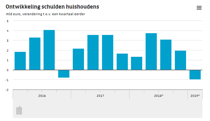 Naast sparen was ook het aflossen van schulden in trek. Voor het eerst sinds eind 2016 namen de schulden van huishoudens af. Het waren deze keer niet de aflossingen op hypotheken die de grootste bijdrage leverden. Vooral consumptief krediet en andere langlopende leningen werden afgelost. Wat betreft woninghypotheken was ook een stijging merkbaar, al lag deze lager dan in de afgelopen kwartalen.