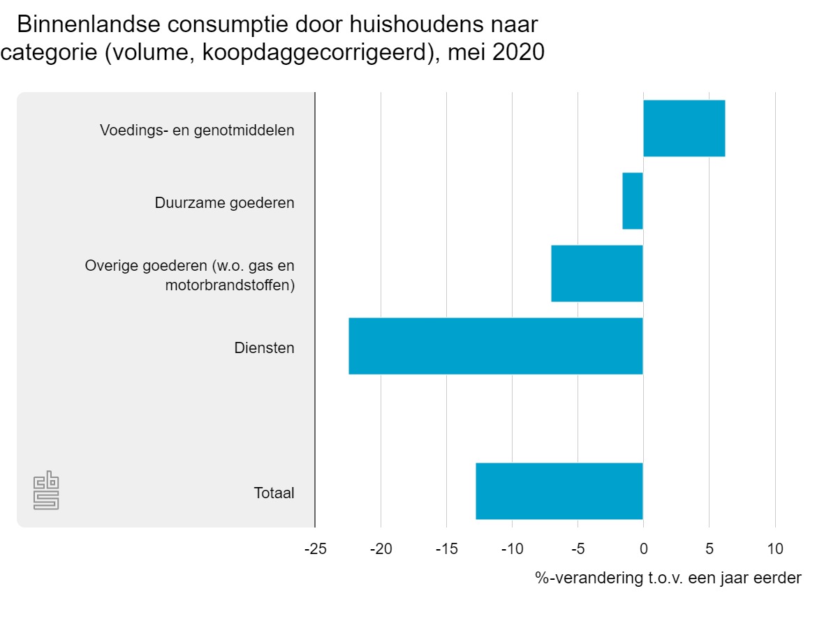 Afgelopen mei hebben we met zijn allen 12,8 procent minder besteed dan in mei vorig jaar, meldt het CBS. Deze krimp is kleiner dan in april. Wel gaat het alsnog om de op één na grootste ooit gemeten. Vooral aan diensten is minder uitgegeven. Onder andere voor eten en drinken werd wel de portemonnee getrokken.