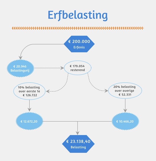 Evert laat aan zijn zoon Erik een grote erfenis van €200.000 na. Van dit bedrag is €20.946 vrijgesteld van belasting. Het bedrag waarover hij belasting moet betalen is €179.054. Over de eerste €126.722 betaalt hij 10 procent belasting, ofwel €12.672,20 . Over de laatste €52.331 betaalt hij 20 procent belasting, wat €10.466,20 is. In totaal betaalt Erik €23.138,40 belasting.