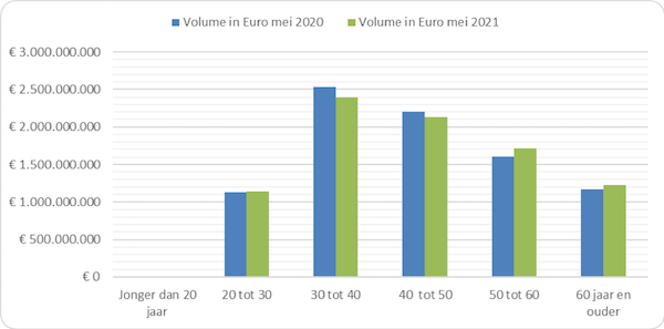 Afgelopen maand ziet HDN een kleine verschuiving in het totale bedrag aan hypotheek dat is gesloten per leeftijdscategorie. In vergelijking met mei 2020 doen de 50-60 en 60+ er een klein schepje bovenop. Andere leeftijdscategorieën leveren licht in. Voor de groep jongere kopers is de markt uitdagend, zeker als er geen sprake is van een huidige woning met overwaarde.