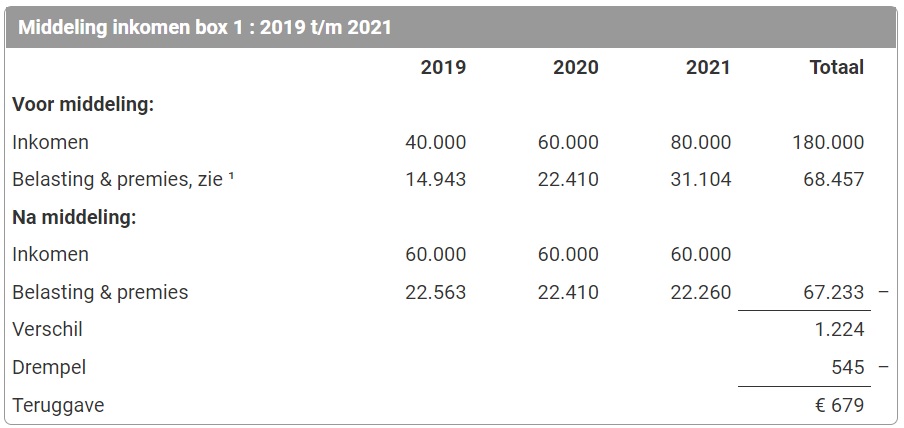 Met de middelingsregeling wordt naar het gemiddelde van drie opeenvolgende jaarinkomens gekeken. Verdiende jij achtereenvolgens € 40.000, € 60.000 en € 80.000 per jaar? Dan wordt het gemiddelde genomen van die drie jaren (€ 60.000) als uitgangspunt voor de belasting. Vervolgens wordt naar het verschil gekeken tussen de betaalde belastingen. Het verschil boven de drempel van € 545 krijg je terug van de belastingdienst. Hieronder vind je een sterk versimpeld voorbeeld terug: