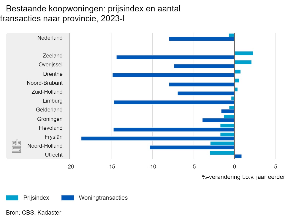 In het eerste kwartaal van 2023 daalde ook het aantal woningen dat van eigenaar wisselden. In totaal werden er 40.437 huizen verkocht, dit is een daling van 7,9 procent. In Friesland daalde het aantal woningtransacties het meest (-18,6%). Alleen in Utrecht werden er meer woningen verkocht dan vorig jaar (+0,9%).